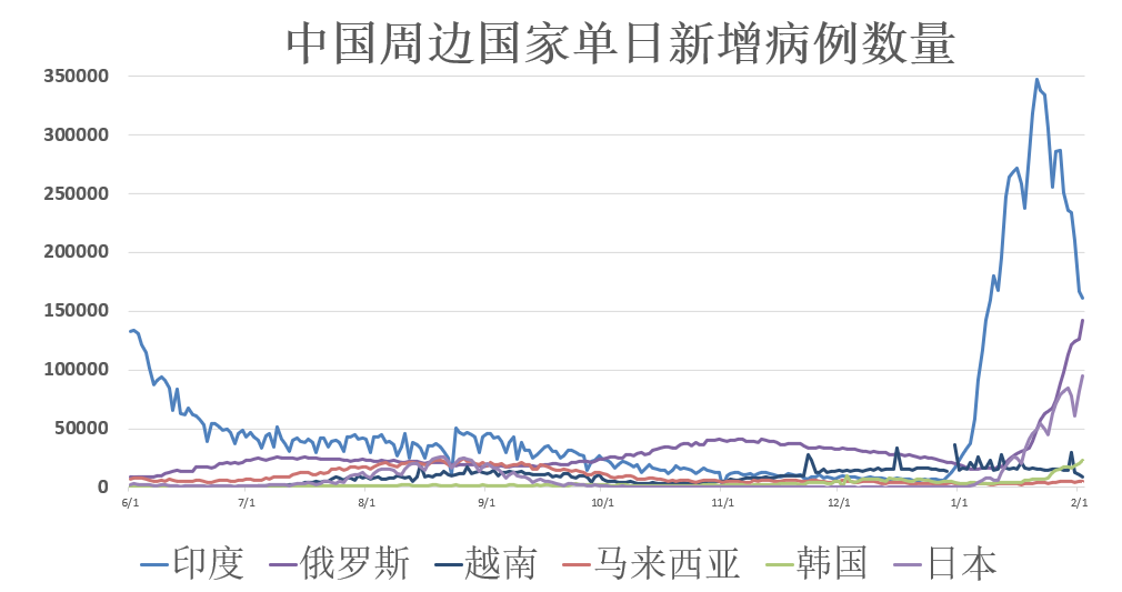 中国周边的多个地区同样正在遭受奥秘克戎病毒的影响,除了印度等疫情数字长期处于高位的地区外,日本和俄罗斯的确诊病例数也呈现快速上升的态势。