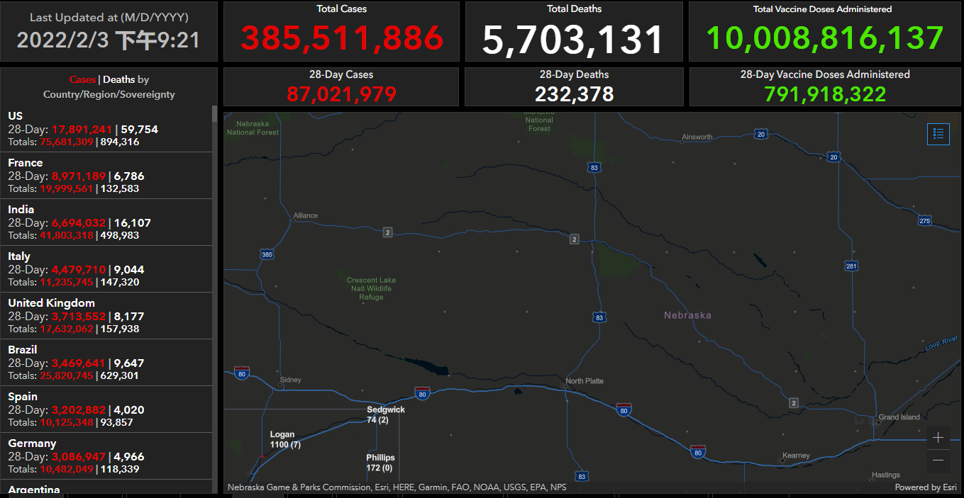 (上海,编辑 史正丞)讯,截至北京时间2022年2月3日22点30分,全球新冠肺炎确诊病例上升至385,511,866例,其中死亡病例调整为5703131例。此外根据统计,全球已接种疫苗数量也在本周突破100亿。