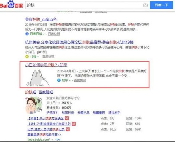 比如我试着去百度搜索护肤这个关键词,在首页就可以找到关于护肤的相关问题,是以知乎问答展示出来的流量,然后点开里面直接去回答。